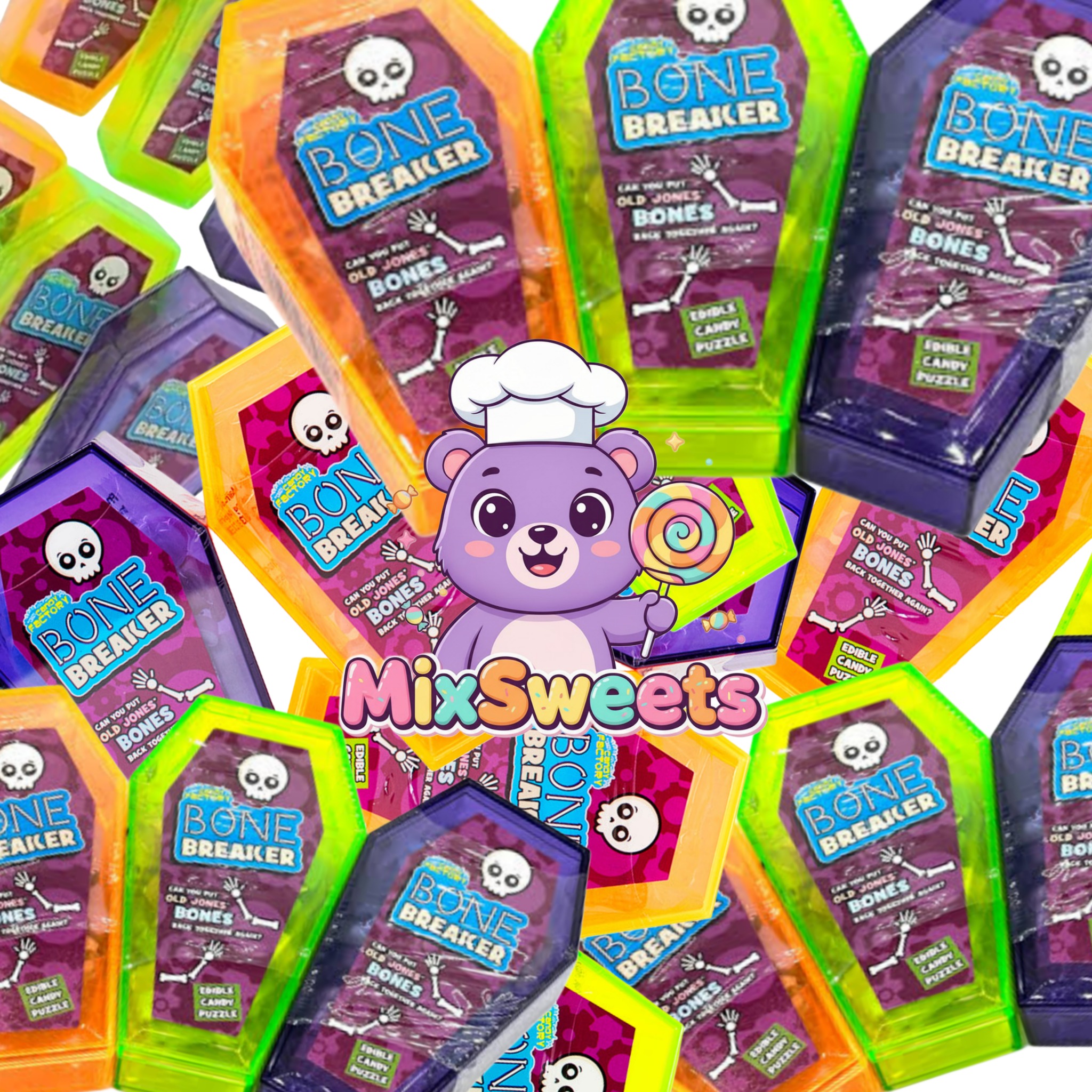 Spooktacular fun! The Crazy Candy Factory Bone Breaker is a novelty fruity candy puzzle. The challenge is to reassemble ‘Old Jones’ bones, offering a fun game before enjoying the treat. The colorful cases and appealing display make this a scarily easy and exciting Halloween novelty sweet.